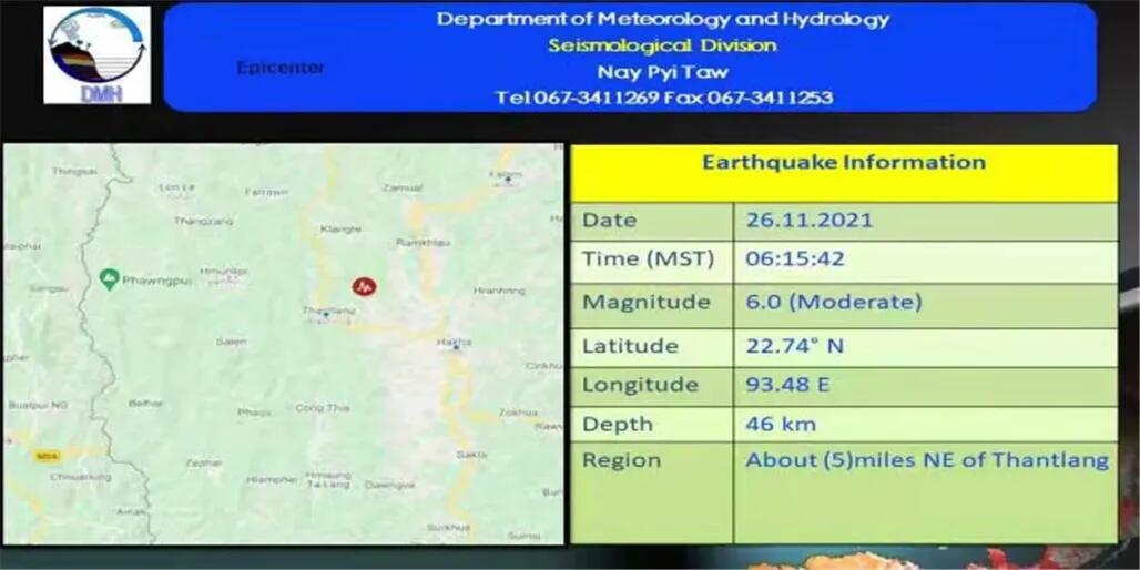 据了解,入选第三届缅甸报刊委员会主席的的吴谬吞,副主席是吴丁貌乌,秘书为吴昻碧松。出席仪式的还有副总理、国家管理委员会成员、联邦部长等官员。 三、据缅甸水文气象局震情通报,今日(11月26日)早6时15分,缅甸西北部地区发生里氏6.0级地震,震中位于北纬22.74度,东经93.48度,位于丹朗(Thantlang)东北5英里、哈卡西北约10英里处。