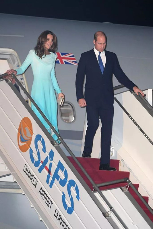 威廉王子与戴安娜王妃抵达巴基斯坦 为表达对巴基斯坦的尊重,凯特王妃特意穿上了由Catherine Walker改良设计的传统巴基斯坦服装Shalwar Kameez,以优雅的气质亮相机场,伞状裙摆为凯特带来华丽感,内搭同色长裤以配合当地风情,渐层蓝色清新亮丽。