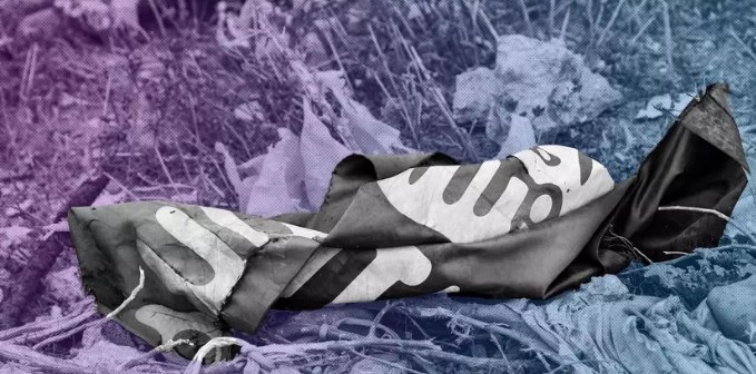 2019年3月24日,一废弃伊斯兰国国旗在叙利亚巴格兹村的地面上