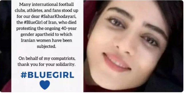 「当你看到一些女生戴著假胡须、穿著男性的衣服到体育场的照片,对一些人来说这只是『不错的照片』。」「但许多女孩被警察拘留后,被遭到性虐待、要求裸身进行检查。而许多人根本不到18岁。」而「蓝色女孩」的死让这起在伊朗的禁令烧到国际媒体,「开放体育场」表示,「对我来说,这很可悲,因为我想到,一个女孩死了,我得到了跟随者。这真是一个可悲的故事。」