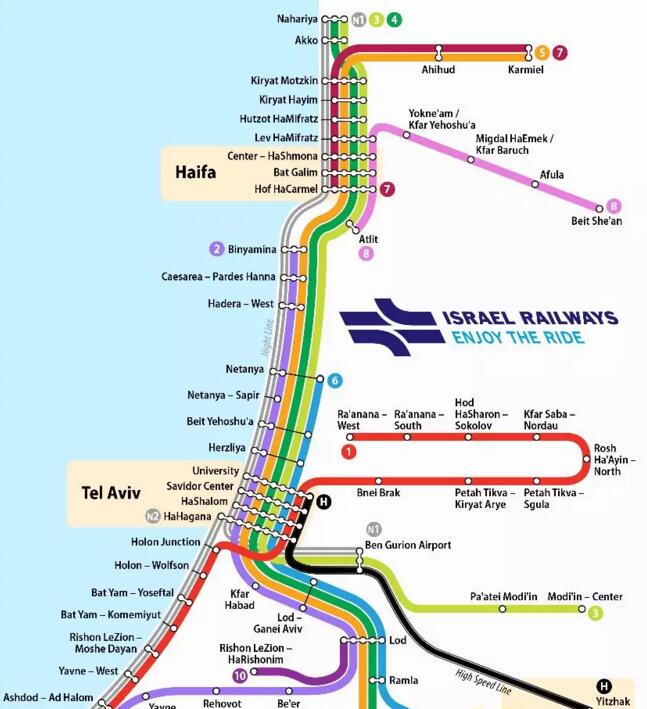 以色列铁路线路图 不同于多家竞争的公交,以色列的铁路则几乎为国有公司IsraelRailways所垄断,它负责运营几乎所有的火车线路。由于以色列国土面积狭小等原因,以色列并没有我国意义上的高速铁路。