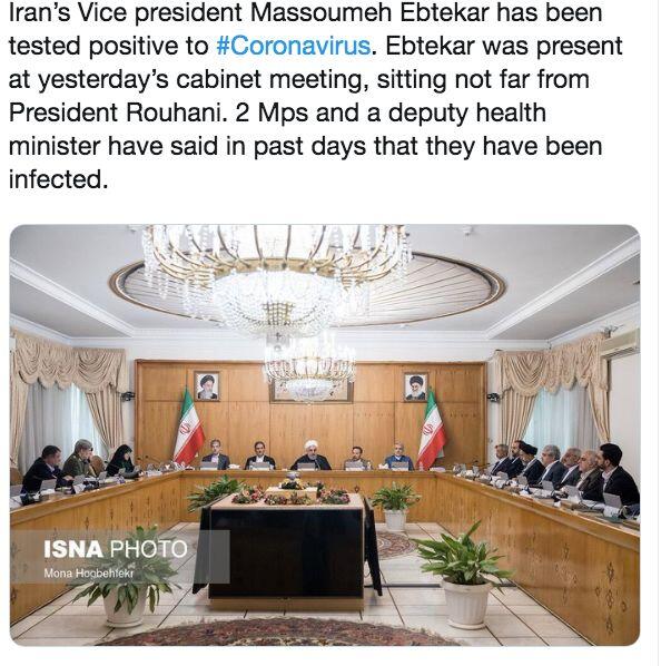 目前,已有多名伊朗国家官员确诊,负责妇女和家庭事务的副总统玛苏梅.埃卜特卡尔(Masoumeh Ebtekar)27日确诊感染新冠病毒。BBC报道,她曾在确诊前与总统鲁哈尼以及多位部长一起召开会议。