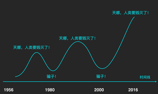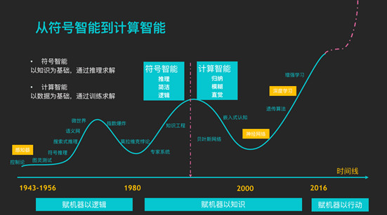 Ai的认知波动 很多人担心,百度all in AI会出现悲剧: 1) AI短期泡沫 。 2)百度占据的AI场景不足。 包括一些『著名』VC人士和二级市场投资人在质疑AI的前景与短期泡沫论,百度如此激进,是不是『病急乱投医』?其实,近几十年来,人们对于AI的态度也是不断在恐惧和蔑视之间震荡,始终没有形成稳定的共识,但是这里隐含着10万亿美元级别的机会。 市场评论人士很少人注意到AI的进步并非一蹴而就,经历的60年的学界积累,甚至在2007年之前甚至都还是玩具一样,近几年的指数级加速,完成了质的突变,AI从『符号智能』跨越到『计算智能』阶段,成果惊人。但是更大格局看,一切才刚刚开始: