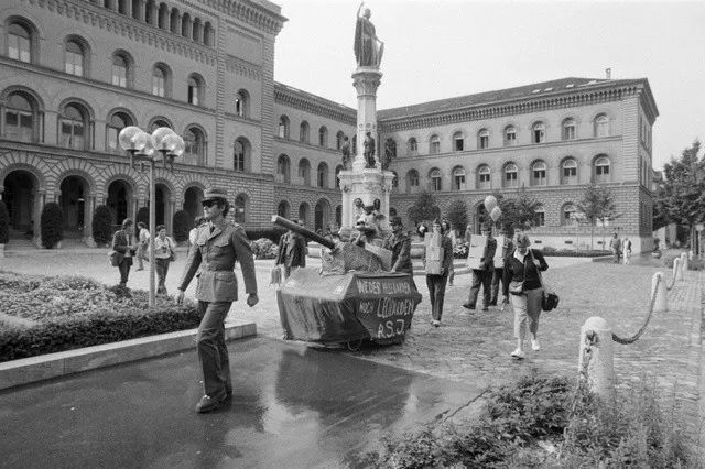 (“瑞士无军队组织”用此种方式递交动议:1986年,伯尔尼联邦大厦前) “我也没想到会有这样的成果,”当已退休的Oliver Krieg再回首时,他这样说。Krieg是该动议的委员会委员,这个委员会拥有近百名成员,其规模之大几乎创了历史纪录。Krieg当时是一名“加油站职工”,他晚间在高速公路休息站工作,这样白天就有时间从事政治活动:为了共同生活,反对核电站。对他来说到索罗图恩州的各个小城市收集签名并不困难:“我的长头发以及锤子和镰刀的绣标让我非常引人注目”。 向这个国家的军事力量发起挑战的还有女性,其中令人印象深刻的便是Renate Schoch,她如今在工会工作。那时Schoch对男友必须服兵役的事深感愤怒。在男友进入新兵训练营的第一周,她就从对政治不感兴趣的人变成了坚定的和平主义者:“当回想起我的男友都经历了什么的时候,我就对这一切厌恶透顶。人为何要以这种方式使别人屈服呢?战争怎么能演练呢?”那是在1987年,对Schoch来说第一次参加GSoA的会议意味着迈出了很大的一步。 Andres Turler后来成为了总参谋长,并进入了苏黎世的市议会。30年前这位自由民主党的法律专家是反对GSoA动议的。如今Turler表示,投票结果并未让他感到意外,他也预料到大部分士兵会投票赞同取消军队:“服兵役既非自愿,也没有意思。我当兵也是为了尽义务。” 联邦的豪言壮语 面对军队的反对者,瑞士官方则抛出了保家卫国的豪言壮语:“瑞士没有军队,瑞士就是一只军队”,联邦委员会在投票前亮出了反对该动议的立场。这个动议伤害了“我们国家所有士兵”的尊严,在议会讨论中一位基督民主党人说到。还有一位瑞士人民党的国民院议员在讲坛上表示,这一“叛国的动议”已触动“神圣领域”:“我们真的已经到了如此地步,竟然有超级疯子要取消我们的军队。” 当然柏林墙的倒塌和华沙条约的终止对选举结果也有影响。但Lang认为,在周日举行投票的那周才爆出来的“Fichen丑闻”时效太短,对结果应该影响不大。那时调查委员会宣布,瑞士有90万人受到了本国情报机构的监视。 如此多的赞同票在向这位老联邦委员诉说:许多人正是通过他们的选票“在发泄自己在军队里所积攒的怒气”。“出乎意料的高支持率”令Villiger的改革之路走得更顺利:“连头脑最顽固的军队首长也意识到,军队要改革了。”