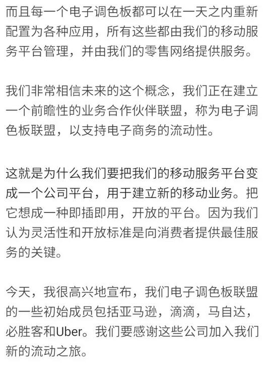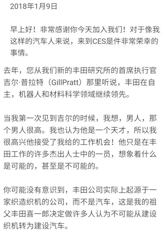 目前 e-Palette 已经和必胜客、Uber、亚马逊以及滴滴达成合作,丰田正在积极推进这个项目,希望能在 2020 年的东京奥运会上让e-Palette 亮相。 随后,丰田章男也宣布,丰田将从一家汽车公司转型成为一家移动出行服务公司,竞争对手也将转变为Google、苹果和Facebook 等科技类巨头! 以下为“海外汽车并购”翻译的丰田章男CES2018演讲全文: