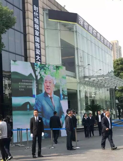 10月30日八时,万向集团董事局主席鲁冠球的悼念仪式在浙江杭州宁围镇的万向集团多功能厅举行。 这是一栋两层小楼,小楼两侧挂着黑底白字的挽联,“时代楷模国家栋梁大德流芳芳播万向定春秋”,“复兴先驱民企巨擘传奇人生生如钱潮名天下”,横批是“深切缅怀鲁冠球同志”。鲁冠球的棺木放在二层大厅中央,上面覆盖着党旗。