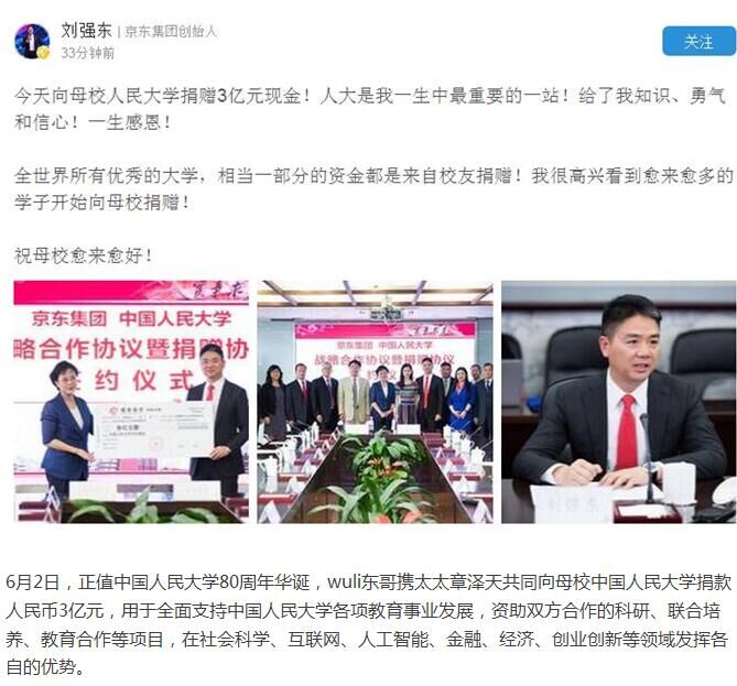 6月2日,正值中国人民大学80周年华诞,wuli东哥携太太章泽天共同向母校中国人民大学捐款人民币3亿元,用于全面支持中国人民大学各项教育事业发展,资助双方合作的科研、联合培养、教育合作等项目,在社会科学、互联网、人工智能、金融、经济、创业创新等领域发挥各自的优势。