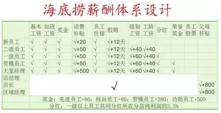 不管你信不信,谈理想的永远只有老板,员工上班就是为了钱。 真正引导员工为企业理想而奋斗的企业,一定会首先着手解决员工的金钱需求。只有员工的金钱需求得到基本保障了,他才能逼迫自己将“柔弱的身躯”跟上老板伟大的梦想。 因而,企业的薪酬设计的好坏,也是公司成败的关键。 先给你看个海底捞薪酬设计的例子。