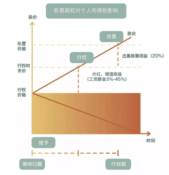 行权日:按照“工资、薪金所得”项目3%-45%的税率,依法扣缴其个人所得税。 应纳税额=(行权日股票收盘价-行权价格)*行权的股份数量 出售日:按“财产转让所得”根据股票出售价格与归属日每股公允价格差额的20%交税。其中,对境内股票转让所得暂不征收个人所得税。