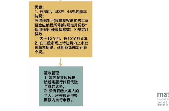 授予日:不产生个税义务。 增值日/分红日:按照“工资、薪金所得”项目3%-45%的税率,依法扣缴其个人所得税。 应纳所得额=兑现收益当日股票的公允价x兑现股数 通过上面的介绍可以得出,企业授予员工股票期权(限制性股票)至员工行权、在二级市场上进行交易的过程中,员工有两个纳税义务的时点,第一次是在期权行权时,按照3%~45%的个人所得税税率,作为工资薪金的一部分进行纳税;第二次是在二级市场交易时,根据财产转让的所得的征免要求进行纳税。 而现行财税政策中针对股权激励纳税的部分,出台了财税“101号文”,企业在满足条件的前提下,给予一定的纳税优惠。可按照以下的自评流程图简单检测自己是否适用该优惠条款。
