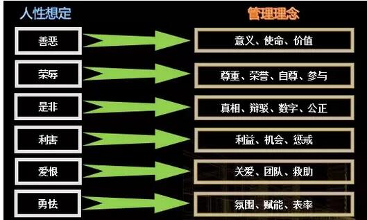 五、高能组织的内核:基于人性的管理 以上7条经验是操作层面的总结。进一步思考、提炼,我们发现:真正要激发一个团队,打造一支铁军,核心是基于人性的管理。由此形成三个层次:第一个层次,是企业文化的鼻祖沙因讲的“人性假设”。这个词不好理解,我换了一个词叫“人性想定”,就是对人性的理解,对人性的设想。第二个层次,是与人性对应的管理理念和原则。第三个层次,是由理念、原则所生出来的管理政策、机制、方法等。所谓“道生一,一生二,二生三,三生万物”。