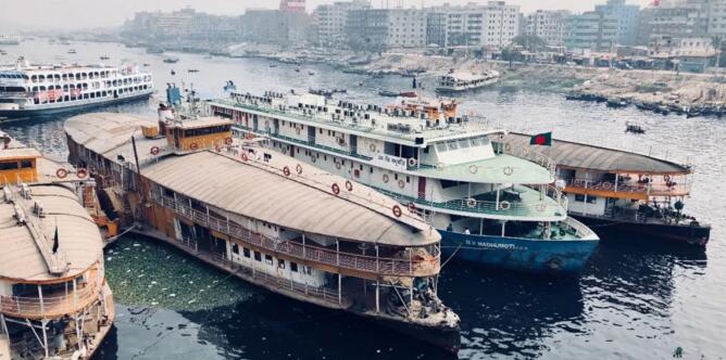 前两天从达卡大学打uber(没错,达卡还是有与时俱进的一面)回去的时候,打到车后足足在路边等了一个小时,已经崩溃! 所以,要靠一双腿才能和达卡零距离接触,距离近的时候坐三轮车、公交车都没有走路快! 【轮船与河流】 这条泛着黑色、已经被严重污染的河流就是达卡的命脉——布里冈加河,位于达卡老城的南边。整条河边都是非常难闻的污水味道,哪怕是带着口罩都能闻到。