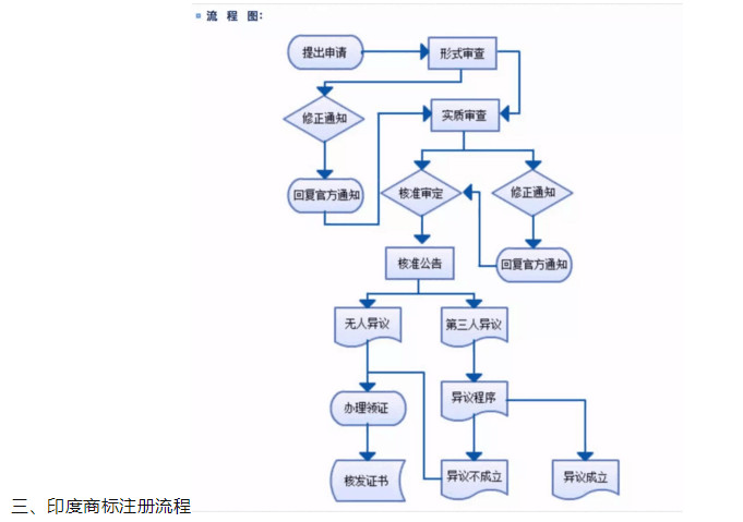 印度商标注册手续需时24-36个月,印度商标注册的有效期为10年,由提交申请日起算。期满前可以申请续展,每次更新的有效期是10年。如属根据公约提交申请的,则注册的生效日期由原申请的提交日期算起。向商标注册局递交商标注册申请书。提交之后就可以使用TM标识,®标识只能在全部完成注册之后使用。 四、印度商标注册的优先权 印度于1998年12月7日成为《关于保护知识产权之巴黎公约》之成员国。因此,申请人可以申请优先注册。印度采纳国际商标分类系统。注册申请书提交后,商标注册处会评估该商标的可注册性和优先权是否存在。如商标注册处接受申请,该商标会被公布于相关的商标刊物(Trade Marks Journal)。