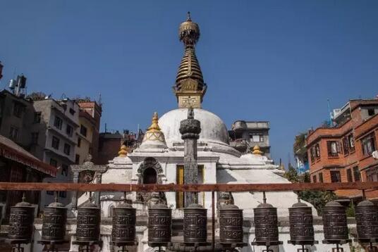 加德满都城里,随处可以见到这种设计精致的佛教庙宇。比如这座庄严的阿育王舍利塔,圆形的基座,半圆形的穹顶,排列整齐的编钟,顿时让人心生敬意。