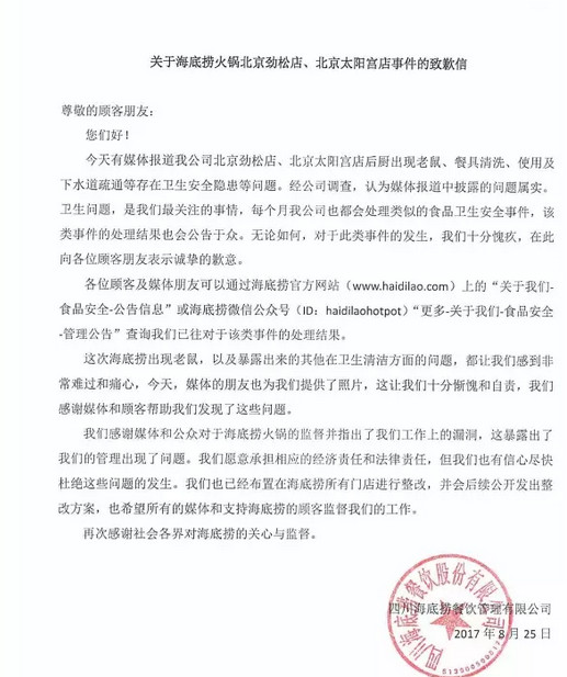 这些细节的公布,不仅使传说中的“相关负责人”瞬间透明,呼应了下文中“主要责任由公司董事会承担”的表述,还用新科技解决了消费者无法监督的疑虑,让一场浮于表面的“危机公关”变为有迹可循的“公关管理”。 不需要“临时工”来顶包 海底捞“处理通报”中第6条,让很多人大跌眼镜—— 涉事停业的两家门店的干部和职工无需恐慌,你们只需按照制度要求进行整改并承担相应的责任。该类事件的发生,更多是公司深层的管理问题,主要责任由公司董事会承担。 反其道而行之,将事件根由衍生到企业管理制度,并在公众面前保全员工。 海底捞一直以来主打“将员工当做顾客来服务”的企业文化。其大多数员工来自农村,经济能力不高,公司鼓动他们“双手改变命运”,并赋予他们给顾客赠送菜品、免单等权利,为其解决住宿,建立子女寄宿学校,对有贡献的员工奖励全家旅游、父母养老金等。 长江商学院副院长、市场营销学教授朱睿曾向界面新闻记者表示,企业社会责任的第一层是员工关怀,“自己都照顾不好的人,怎么去关心他人”,而公众往往认为,心系员工的企业,不会对消费者太差。 有了这么多年培育的企业基因,海底捞如今这一“另类”应对才显得不做作。同时,它没有对员工进行偏袒和回避,表示涉事员工“需按照制度要求进行整改并承担相应的责任” 。 在社会形象几乎要崩塌的一刻,是长期的企业基因为它挽回了些许余地。 面面俱到,第一时间回应 鲍勇剑曾向界面新闻记者表示,越是千钧一发的时刻,管理者越需要明确企业必须保护的生存资源是什么,在“消费者、员工、供应商、政府部门、媒体”中确定最关键的利益相关者,才能寻找到可以为己所用的转折机会。 我们几乎可以在海底捞的致歉信和处理通报中,看到每一位利益相关者的身影。 “今天,媒体的朋友也为我们提供了照片,这让我们十分惭愧和自责” “我们感谢媒体和顾客帮助我们发现了这些问题” “欢迎顾客、媒体朋友和管理部门前往海底捞门店检查监督” “门店在此次整改活动中,应依据所在国家、地区的法律法规,以及公司相关规定进行整改” “涉事停业的两家门店的干部和职工无需恐慌” 毕竟,这一刻,生存才是首要目的。 鲍勇剑告诉我们:“危机既然发生了就是好事”。它作为系统失控的信号,有大量尚未被挖掘出来的价值。每个企业都有漂亮一次的机会,“但别忘记,只有一次。”