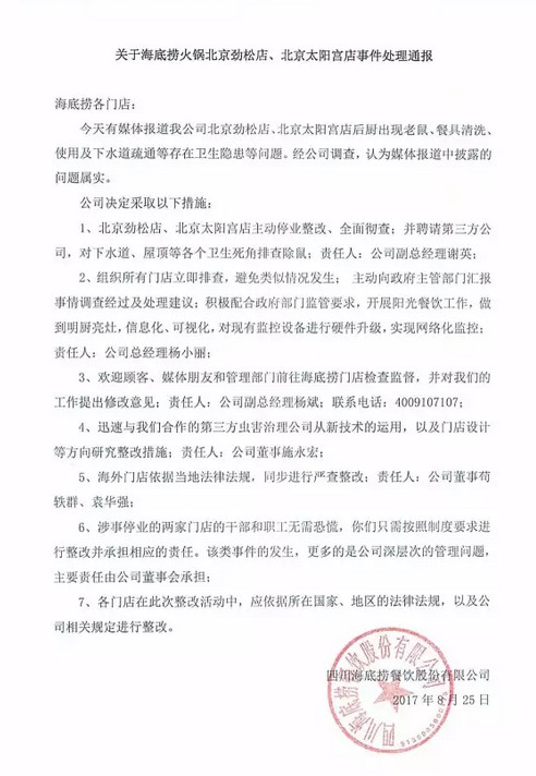 “相关责任人”纷纷浮出水面 “区别危机公关和危机管理方法之一,就在行动承诺。” 鲍勇剑向界面新闻记者表示,一切没有行动承诺的表态,至多是漂亮的危机公关,而能够经得起检验的危机管理一般包含下面的具体行动陈述: “我们已经发现的问题有……” “我们正采取的行动是……” “我们还将落实……” “检验上述行动的时间节点在……” “如果没有做到,我们承诺的惩罚为……” 海底捞在最短的时间内,已经在处理通报中出台了一些具体的行动陈述: 聘请第三方公司,对下水道、屋顶等各个卫生死角排查除鼠。 与第三方虫害治理公司从新技术的运用、到门店设计等方向研究整改措施。 公布一系列整改措施的具体负责人的职位、姓名甚至联系电话:网络化监控——公司总经理杨小丽、监督意见联系人——副总经理杨斌、海外门店责任人——公司董事苟逸群、袁华强……