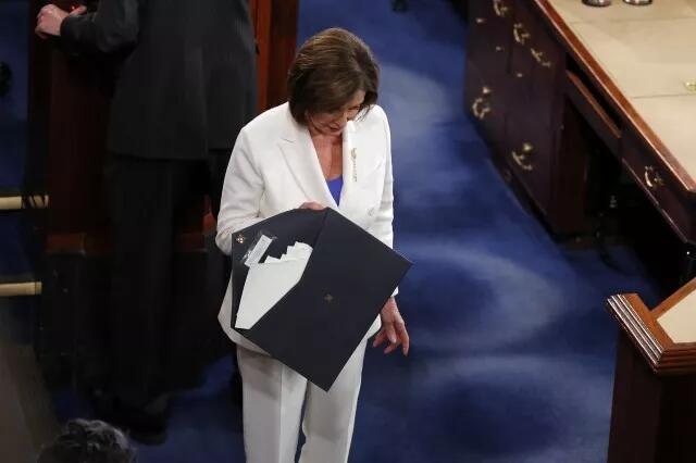 特朗普全程面部表情冷淡。走向演讲台,特朗普向副总统彭斯(Mike Pence)和佩洛西递交国情咨文打印版文本时,特朗普也没有和两人握手。尤其是佩洛西主动伸手,未得到特朗普的回应。结束演讲时,佩洛西撕毁了特朗普递给她的国情咨文手稿。