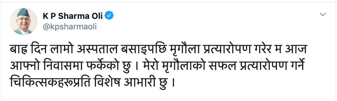 再次成功换掉一个肾的尼泊尔总理奥利,于3月13日晚出院了。 奥利是在3月2日住院的,并在3月4日进行换肾手术。在身体各项各项条件都有所恢复的情况下,他在3月13日晚出院。