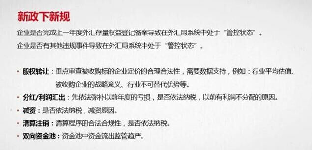 文:赵清 1境内企业对外直接投资涉及的资金出境的五个常见错误 由于中国目前没有开放个人境外直接投资,境内自然人无法合规申请资金汇出到境外购房置业、进行资产配置等,中国企业境外投资会有一些常见的错误,而很多公司通常是在上市前做合规检查时才发现其问题所在。 常见错误一:超越法规及未经批准。 持中国护照的自然人在海外设立公司而未经外汇管理局登记是不合规的,而更不合规并会引发处罚的是通过这个海外公司,又在国内设立外资企业。这种不合规的返程外资企业常常会在办理外汇登记时谎称追溯境外的股东中没有中国人以骗取外汇登记。这样的虚假承诺会给未来上市的法律尽职调查埋下巨大隐患。在美国、香港等境外地区,只要提供当地需要的注册文件,支付注册费用,就可以顺利注册公司,但是根据中国的法律,任何一个境内个人或境内企业到境外投资,都要经过相应主管部门的登记或备案。