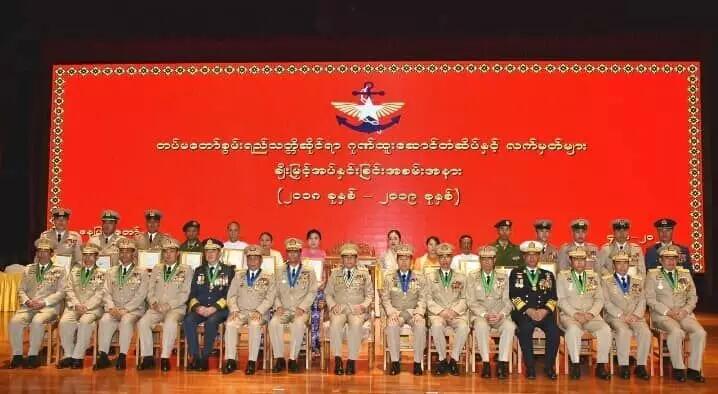 内比都消息,1月4日独立日当天,三军总司令敏昂莱大将出席2018~2019年度优秀军人授勋仪式。敏昂莱大将与军方高层将领为年度优秀军人发放勋章及荣誉证书。