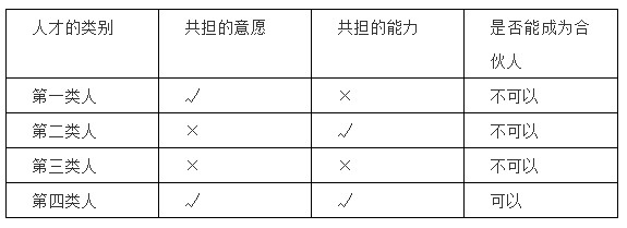 案例:有个企业(上市公司)推行事业合伙人机制,经过讨论确定成立独立的公司,上市公司占股80%,团队占股20%,团队认为上市公司应成为小股东才能保证公司的良性发展,上市公司也认同,最终确认上市公司占股不超过20%,团队占股80%以上,独立发展。但到公司注册和出资的时候,团队内部出现分歧,有些人认为无法承担出资的责任,老板好心,承诺以借款的方式替员工解决出资责任,员工仍然担心未来的万一干不成,还款成为压力。我们建议公司取消这个合伙人计划,因为合伙人既没有共担的意愿,也没有共担的能力。 为什么我们强调共担的意愿和共担的能力缺一不可?我们对上述案例的解读为:赚了钱,大家跟着一起赚;亏了钱,公司亏,我们不承担责任。对于这种情况,无论这些人多优秀,也不能成为合伙人。我们在历史上看到过很多这样的合伙人机制,没有一个成功。所以,从我们实践当中获得的经验,共担是对一个人是否真的做好了充分的准备成为合伙人的一种有效检验方式。 综上,没有共识和共担作为合作的前提,共创共享都不存在。那么,是否有了共识和共担的能力就能成为合伙人呢?也不完全。因为事业合伙人不是以出资能力来判断是否能够成为合伙人的条件。本质上,事业合伙人机制是用资合的法律结构来完成智合的战略构想,所以并非按出资能力的大小来决定份额的多少。简单来说,你要激励的不是出得起钱的人,而是真正认同战略、有能力并愿意为之奋斗的人。所以,共识和共担的能力+意愿是成为事业合伙人的必要条件,而不是充分条件。 ![]()