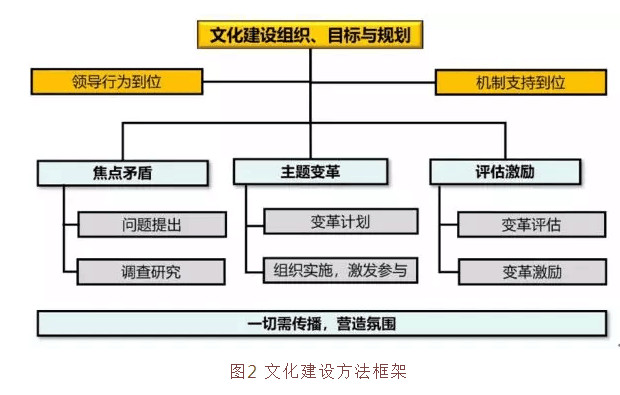 这个图最大的意义是让我们明白,企业文化建设和业务是一张皮,如果文化建设和业务变成了两张皮,那一定是错的。 我举一个场景,大家来理解一下企业文化建设和业务一张皮的关系。比方讲,某企业追求技术先进,但出现了很多客户对产品不满意的情况,原来他们追求的技术先进,并没有解决客户的问题。这是现实问题。而这个现实问题的产生,是员工存在某种认识的误区,比如,研发人员对“以客户为中心”意识的偏离,把片面追求技术先进作为荣耀和功绩。这是员工存在某种认识,必然会导致的某种行为。那么企业文化建设怎么做呢?组织研发人员进行讨论,把客户不满意的事实摆出来,讨论要不要以客户为中心,讨论对于一个研发人员,到底什么是“功绩”。通过这种方式,改变研发人员的认识,不再是“以我为中心”,闭门造车,而是以客户为中心,不再是片面追求技术先进,而是必须为客户创造价值。这就是通过企业文化建设改变员工的认识,从而改变员工的行为,进而促进现实问题的解决,支撑战略目标的实现。 通过以上场景案例,大家发现没有,企业文化建设和业务是一张皮,文化建设和业务又是如何有机结合的。 企业建设有哪些手段呢?我做了如下总结,见图2。