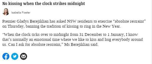 跨年夜即将到来,但由于新冠疫情影响,堪培拉取消了今年的新年夜烟花表演。随即代替的是城内不同地区的灯光音乐会。 2.新州禁止跨年接吻,要求绝对克制