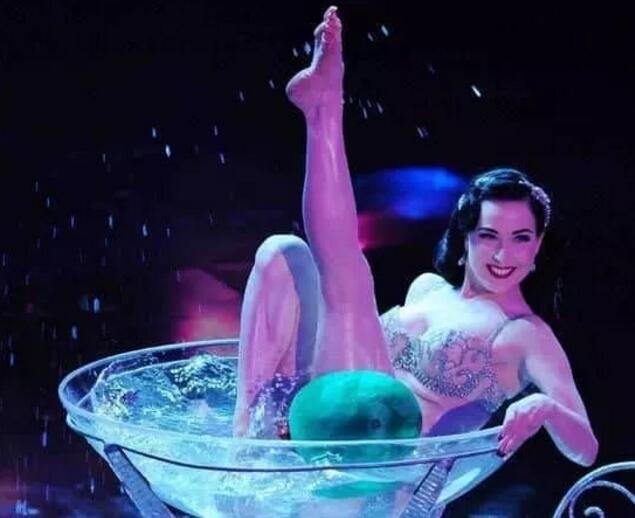 Dita Von Teese马提尼酒杯舞 她最著名的表演就是在巨大的香槟杯里翩翩起舞 这成了她的经典表演和个人标志 她让脱衣舞渗透出表演者个人的风格特点,这样的表演不会让人感觉故作性感。她深谙“对幽默感的领会是一场美好滑稽的脱衣舞的关键”的道理。这样被认真对待的脱衣舞吸引了无数仰慕者。 在2009年Dita欧洲巡演时,就连当时的法国总统萨科齐和第一夫人还偷偷和Dita联系,表示“我们很想去看你的演出,但迫于身份,实在没法去。” 她的情色,可真是男女通吃。