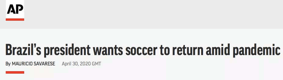 “球员们如果感染了病毒,死亡几率低。因为他们的身体状况(好),因为他们是运动员。”博索纳罗在接受巴西瓜伊巴电台采访时说道,由于面临失业风险,足球领域也有很多人想恢复比赛。