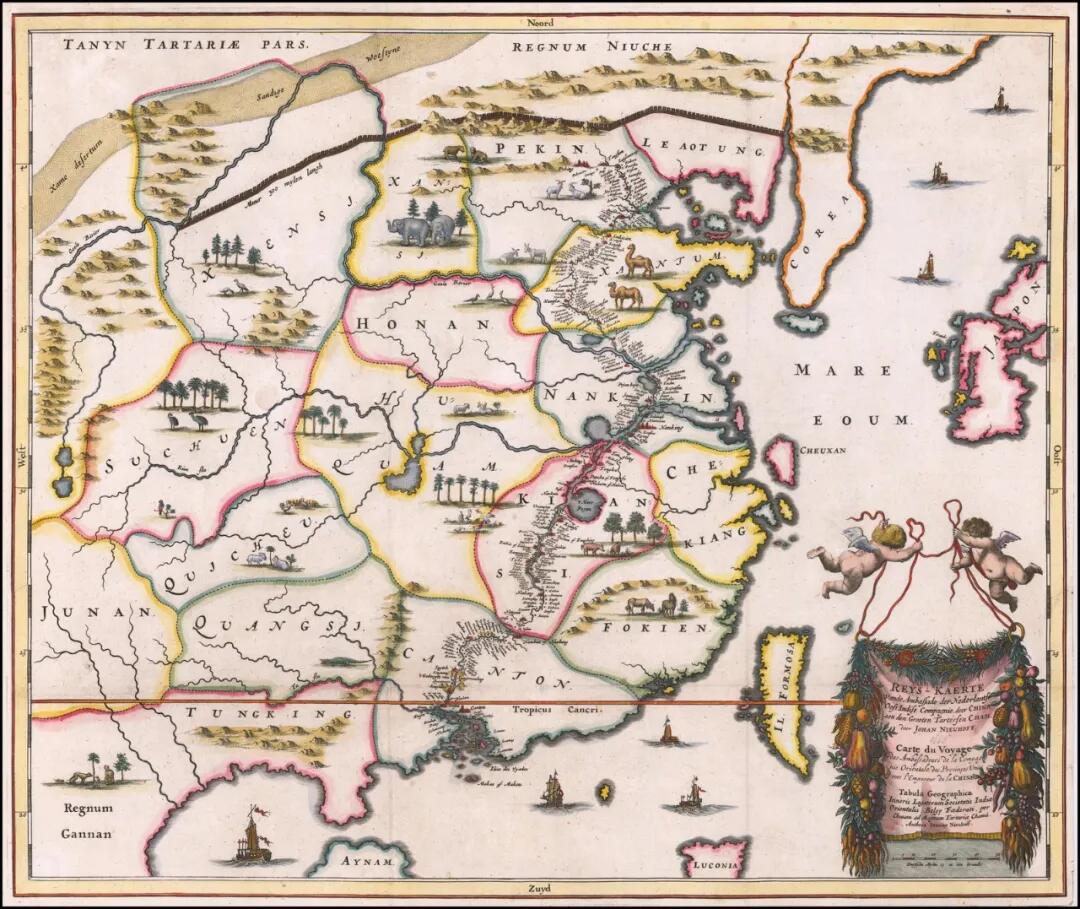 “广州小藩王” 1655年-1657年间,尼霍夫和荷兰使团都在中国逗留。他还标出了当时的访华路线:从广州至北京的2500公里长的线路,大部分是行船水路。 在广东省内,使团沿着北江而上到江西边界,再转陆地,翻越梅岭关,再艰难地抵达长江水域。使团再从扬州坐船,通过大运河进入京城。 1656年10月2日,尼霍夫所属的荷兰使团获得顺治皇帝的接见;10月16日返回广州,再从广州离开中华帝国。