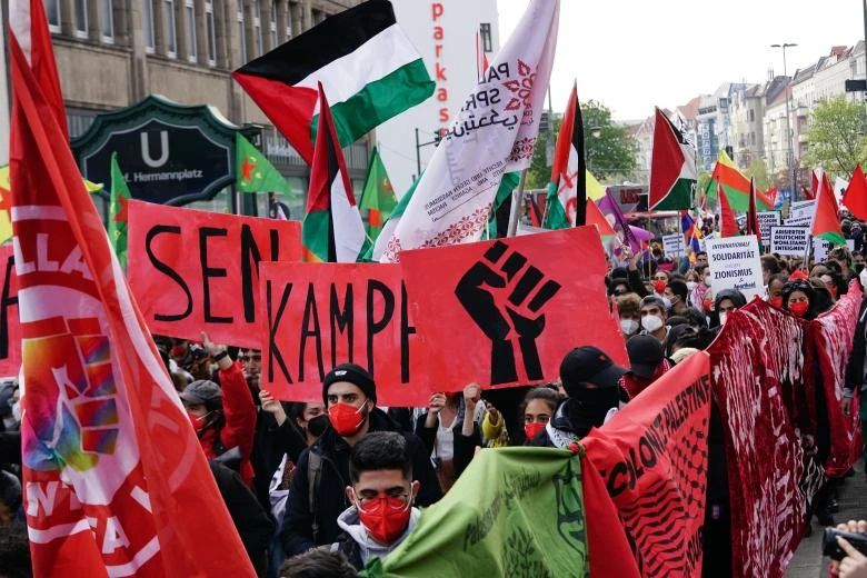参加示威游行的还有“黄背心”运动成员,该组织在三年前引发了一波规模庞大的反政府抗议活动,并受到来自受到诸如文化之类行业从业人员的欢迎。虽然游行者大多数人戴着口罩,但社交距离是绝不可能遵守的,并且,相当一部分人没有佩戴口罩。 据巴黎警察局表示,他们在巴黎街道部署了5000名警察,他们成功地阻止了“黑人集团”等无政府主义者团体的破坏活动,有三名警察受伤。 在巴黎街头,参与者与警察之间发生了暴力冲突。据警方称,左翼黑人集团的支持者试图阻止联盟抗议游行穿越法国首都。 德国 疫情如此严重,昨天(5月1号)傍晚柏林街上有近万人游行示威,他们游行示威的主题有超过20多个,比如关于涨房租,移民政策,疫情政策等等。