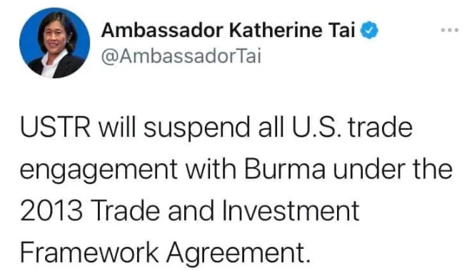 那科村隧道全长9296米,中老铁路全线第二长隧道,穿越4个断层带,地质复杂,施工难度大,安全管控风险高。自2017年5月开工以来,中铁广州局项目部攻克复杂地质带来的施工难题,积极创新,形成“东南亚雨林隧道软岩关键技术”等科研成果,并于2020年6月21日顺利贯通。 缅甸 一.美国宣布全面终止与缅甸贸易往来,立即生效 3月29日晚,美国贸易代表凯瑟琳.戴(Katherine-Tai,中文名:戴琪)在社交媒体上发文称,美国根据2013年《贸易和投资框架协议》(TIFA),决定暂停与缅甸的所有贸易往来,该决定立即生效,直到缅甸民选政府回归执政为止。