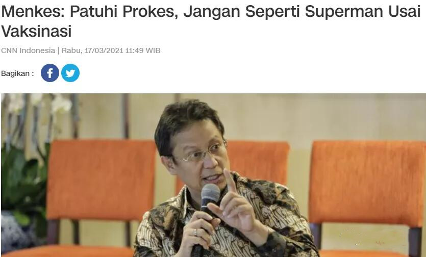 2019年3月18日,马来西亚落实“MCO行动管制令”,在国内执行人员行动管制并封锁边境。当天凌晨12时,关卡交警拉起封锁线,不让车辆继续通行。 在行动管制令落实前夕,大批劳工漏夜从马来西亚赶赴新加坡,柔佛长堤和大士第二通道严重堵塞,通关车潮长达数公里。 印尼 一.2021年3月18日印尼新增确诊新冠病例6570例。 二.印尼卫生部长:打了疫苗不会变成超人 3月17日,印尼卫生部长布迪(Budi-Gunadi-Sadikin)说:“我们不会突然变成超人,所有病毒包括新冠都不会感染我们,”