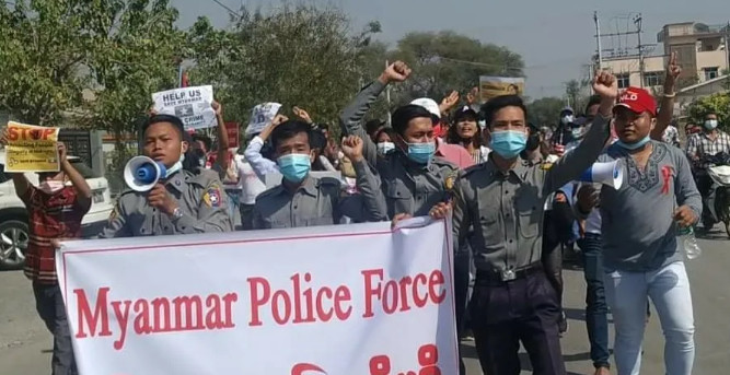 克耶邦垒固镇再有警员参加示威 克耶邦消息,2月14日,垒固镇教育部下属公务员,加入到示威大军中。此外,2月14日的示威抗议活动中,再有3名警员参加示威。 截至2月14日,克耶邦已有64名警员站出,与民众们站到了一起。 土瓦市示威队伍中出现警员身影 德林达依省消息,今天(2月14日)土瓦市示威抗议活动,示威人群中出现了警员身影。 三.缅甸军管宣传部命令媒体禁止使用“夺政”等词语 缅甸军方接管政权后,重新成立的宣传部向新闻媒体发布通告,要求报道时不可使用“夺权”等词句进行报道。 该通告信息称,缅甸军方依据2008年宪法宣布国家进入紧急状态后,成立了国家管理委员会开展工作。新闻媒体进行相关报道时,严禁使用“夺权”等词语进行报道。 出版行业法第4张第8条例规定,出版发行报纸、报刊时,不可出版发行会影响国家安全、法治工作、公众稳定、国民平等、自由、公平等方面的信息。 四.缅甸军方发布通缉令,称知情不报也违法