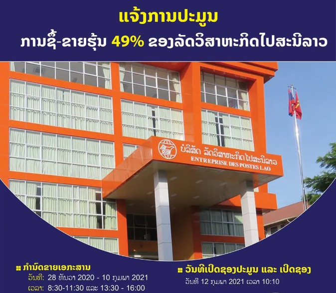 老挝国防部高层全体祝愿老领导,身体健康长寿,并继续给予政府和部队指导。 2.商机!根据老挝媒体《老挝发展报》20日报道,老挝国家邮政企业于近日宣布出售49%的股份,并于2月12日上午10:10举办拍卖,诚邀各界人士参与竞拍,标书购买时间为2020年12月28日至2021年2月10日。