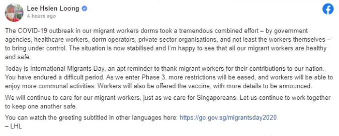 在法庭上,越南交通运输部原部长丁罗升被告认为,其他多名有关被告的供述是不正确。例如,被告没收到有关落实胡志明市-忠良高速公路收费权转交提案的所有公文;没收到越南政府总理关于“准许BIDV高速公路发展股份公司不继续落实胡志明市-忠良高速公路收费权转交提案和胡志明市-忠良高速公路BOT项目以及按原状移交交通运输部”内容的公文;出售胡志明市-忠良高速公路收费权的合同;被告阮鸿长签字的若干公文也没递交给被告等。 被告丁罗升否认起诉书提出的犯罪行为,同时告知,在起诉书的6项内容中,只有1项内容的一部分是正确。被告丁罗升表示:“起诉书提出’以部长的责任,我须承担全部责任’。我只承担政治及行政责任而不能让我承受刑责。” 【新加坡】 1.新加坡总理李显龙宣布:新加坡将为所有客工提供免费注射冠病疫苗!