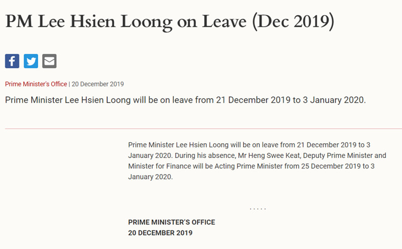 文告中写到,从今年12月25日到明年1月3日,新加坡副总理兼财政部长王瑞杰将会全面接管总理事务。