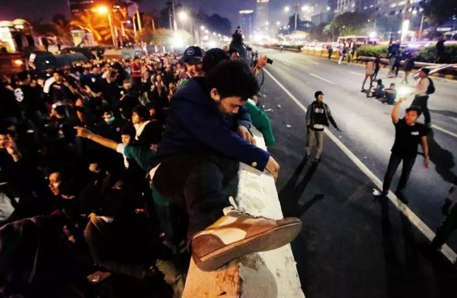 包围国会,要求要见议长,他们挥舞着印尼国旗高唱国歌。 夜幕降临时,部分抗议者还推翻了议会大门。