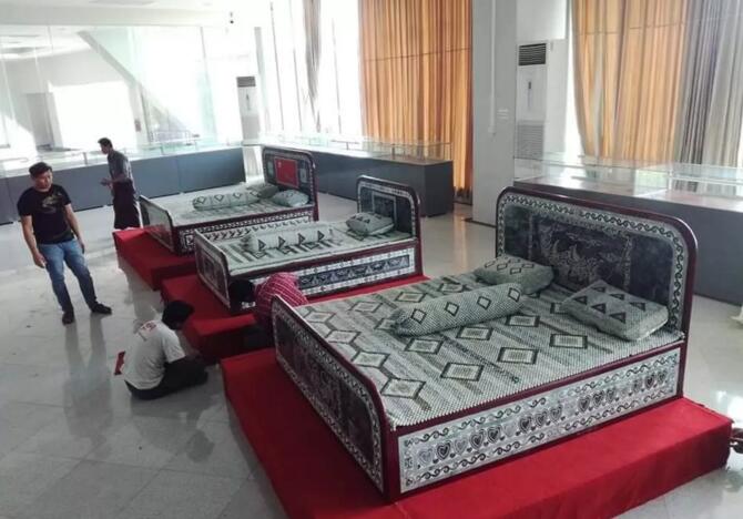 这三件大宝贝便是曼德勒瑞纳迪玉石珠宝公司制作的3张玉石床,分别是2张6英尺x6英尺6英寸的双人床和1张4英尺10英寸x 6英尺6英寸的单人床。 如此豪气逼人的玉石床,用料也是相当舍得,双人床的床垫使用了18000多颗玉珠,抱枕使用了3700颗玉珠,枕头使用了1200颗玉珠,并且床头还雕刻有民盟党旗、昂山素季像及和平鸟图案。单人床的床垫使用了14000多颗玉珠,抱枕和枕头总共使用了4000多颗玉珠。