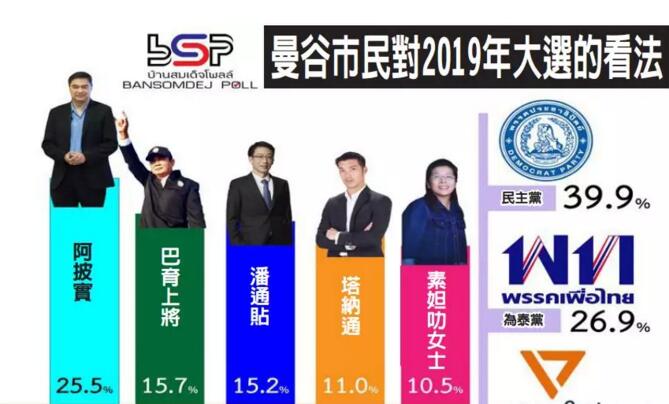 谁是最适合担任政府总理的人选?25.5%认为是民主党党魁阿披实;15.7%认为是现任总理巴育上将;15.2%认为是前总理他信的儿子潘通贴;11%认为是新未来党党魁塔纳通;10.5%认为是为泰党大选战略委员会主席素妲叻女士。 同时,受访者最愿意推选的民代类型是诚实、公正透明的人,占39.8%;其次是尽最大努力工作、不断为社会做贡献的人,占19.5%;其他依次是有能力、有教育背景及较多工作经验的人,占15.6%;坚持为地区发展做出贡献的人,占10%;以及政治家族后代,占6.3%。 对于希望政党重视哪方面政策?27.3%的受访者表示希望重视经济和促进就业;其次有26%选择提高教育和生活质量;15.5%选择法律和公平公正;9.6%选择公共卫生与环境;9.5%选择艺术文化与发展社会。而影响大选投票选择的因素,58.1的受访者表示受参选人影响,41.9%表示受政党影响。 如果进行全国大选,39.9%的受访者表示将选择民主党,还有26.9%选择为泰党,11.8%将选择新未来党,6.4%将选择巴差叻力量党,4.1%将选择泰自豪党。 ![]()