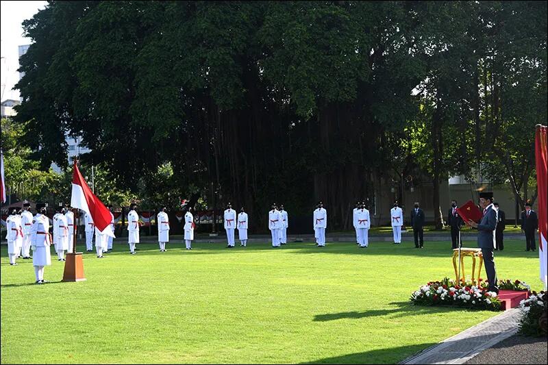 三.总统佐科维于周四(8月12日)在总统府独立宫草坪宣布68名高中生正式就职成为国家旗手队(Paskibraka)新成员。