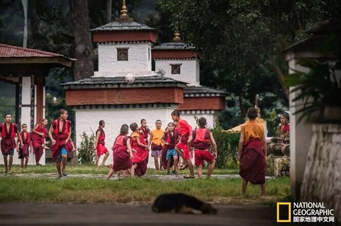 十几个小僧人正在草地上踢足球。 从普那卡宗堡出来,有一处佛学院。我听到院内传来孩子们快乐的叫喊声。穿过门廊,进到一处小广场,那里,十几个小僧人正在草地上踢足球,他们没有球鞋,少数几个穿着凉鞋,其他人直接光着脚。尽管如此,并未影响他们的专业发挥,头球助攻,长传突破,踢得有板有眼。只是他们穿着几乎同样的红衣,看了很久,也无法辨别他们分属的球队。不过,仅仅是这春天里的欢快,感受他们嬉戏的快乐瞬间,就已经令人心情愉悦了。