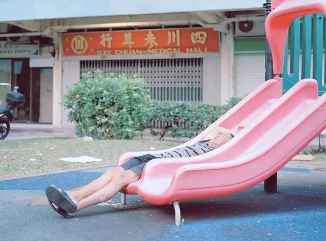 老人坐在贴着水管的方柱前,感觉找到了“靠山” 摄影师Nguan是一个土生土长的新加坡人,从小受到南洋文化影响,之后前往美国西北大学学习电影与视频制作。 让人感到惊叹的是,他特别热爱拍摄城市,也热爱城市——不是那些繁华的、时尚的,而是安静的,沉默的,最真实的和最普通的。 他认为,自己的摄影其实是对于时间碎片的一种捕捉,往往这些瞬间才真的能够展现更丰满、更真实的生活。 在他的照片里,动与静被凝固成时间的形状。 而颜色又是奇异地停留在干净与真实的分界线上。 他的照片里,有最超现实、又最现实的新加坡。
