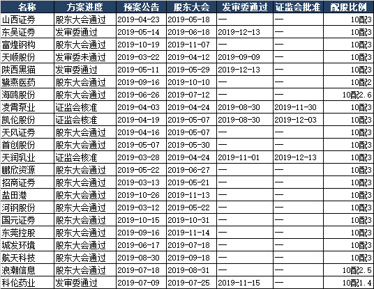 配股有四个步骤,一般证监会批准是最后一个步骤,意味着随时都可以启动了,看表格就知道,最接近的是凌霄泵业、凯伦股份、天润乳业,其余的都在走流程,你们若有上述股票,记得要关注上市公司的公告。 “装死”股民最怕遇到的事 1.配股是什么意思呢,稍微科普下:配股是就是向原股票股东按其持股比例、以低于市价的某一特定价格配售一定数量新发行股票的融资行为。 2.配股有什么影响? 配股这个事情,其实碰到了,对于散户投资者来说,真的是有苦说不出,如果你不配股,别人都配了,等于说你白白损失了这10%到20%,这部分市值你就没了。如果你配了,可能你就得真金实银的掏这个钱,或者你借钱。这种跟高级乞丐也没啥区别了。 所以对于配股这种事情,我个人的看法就是,很恶心。有配股行为的上市公司都是流氓上市公司。 举个例子某只股票现价19.41元,配股方案是10配2.6股,配股价格是6.87元。简言之就是该股票的股东,每持有1000股,就有权利以6.87元的价格认购260股。 这听起来是好事,但配股结束后股价要除权的,我这里列一个数学公式你看了就懂 (19.41*1000+6.87*260)/(1000+260)=16.82 也就是说配股结束后,股价自动变成16.82元,注意这是强制性的,不管你是否参加配股,最后开盘都是16.82元。 如果你认购了,相等于加仓了一笔资金,不赚不赔。 如果你放弃认购配股,你就亏损14%,因为你放弃认购的配股,就被承销券商以6.87元的价格拿走,他们将获得144%的暴利。(16.82/6.87=244%) 每年都会有4-8%比例的股东放弃认购,有的是不懂配股是怎么回事,有的是股灾被套账户都懒得看的,有的是最近正好没有关注股市的,总之这些人就白白亏损14%。 解决办法: 1、缴款前一个交易日把该股票卖了,和你彻底没关了。 2、准备资金在缴款时间内参加配股的认购。