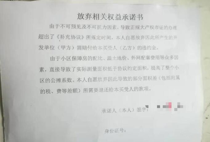 社会的毒打从天而降,单纯的业主瞬间懵逼。 这个合同,几乎就是在公开的说:房子虽然是你花钱买的,未来可能会出问题,但你一定没有评论权。 开发商拥有烂房子的建设权,业主却没有公开评价烂房子的批评权。 我可以公开毒打你,但你不能对外评价我的鞭子甩的不够好、不够响亮。 这不是买房子啊,朋友。 这是开发商对业主的一次公开PUA。 跪下,别哼哼,喊爸爸。 未来青溪府的业主,连讨论一下房屋漏水的问题,怕是都要夫妻俩钻在被窝里讨论了。 嘘,小点声。墙不好,别被人听见。 天呐,你怎么敢说咱们的墙不好。 2.用霸王合同鞭打业主,小开发商玩儿的更是熟能生巧。 更厉害的行为艺术者们,甚至能在空中甩出鞭花。 石家庄的一位小房企,三次高高扬起霸王合同的鞭子,打的业主们是头晕目眩。 石家庄都市怡景,一个几乎能列入中国地产开发魔幻史的小区。 这个魔幻小区,业主都已经收房三年,开发商却还没有拿到土地证。 2018年,开发商终于拿到土地证,准备网签备案,办理房产证。 被教育三年之久的业主,以为就要解脱了,也不要违约金了。 反正三年房价也涨了,开开心心拿证,就当被动投资了。 此时,魔幻的骚操作出现了—— 开发商以“时隔三年,房价已涨”为由,要求业主补差价。 不补差价,就不给办房产证。逾期办证,业主还要交违约金。 你瞧瞧,这说的叫人话吗? 开发商用一波违规逾期,帮助业主完成一场被动投资。到头来,业主吃进去的利润,还要再吐出来。 一波反向操作逻辑,吊打得业主哑口无言。 算了算了,息事宁人,能顺利办证就算不错了。 单纯的业主,乖乖巧巧的补了差价。 半年后,更骚的操作出现了—— 在办理房产证的过程中,房管局测绘面积比购房合同少6.2平米。 按道理,开发商秉承合同里的“多退少补”原则,应该给业主退钱。 但是,开发商却逼着业主,签订一个《放弃相关权益承诺书》的补充协议——
