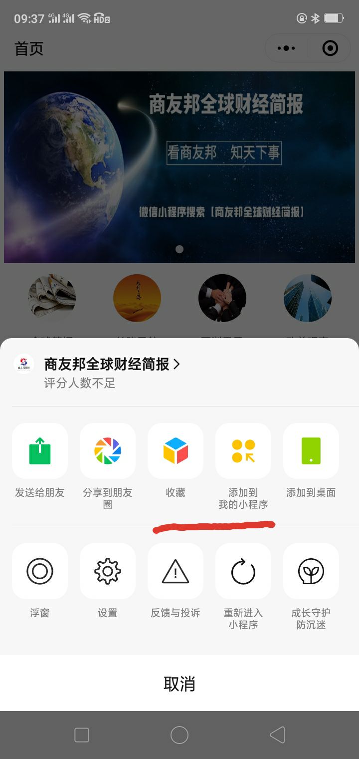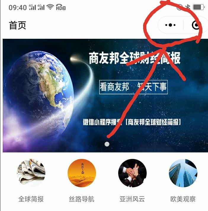 楼主(阅:86313875/回:0)通告:新系统启用,本杂志停止更新尊敬的用户,您好 本杂志系统将于2021年元旦停止更新 感谢您多年深情的陪伴与厚爱 请您移步我们的微信小程序用户端 继续关注【商友邦全球财经简报】 在那里您可以纵览天下事。 那么怎样才能找到我们呢? 第一步 在微信首页下拉一下, 您就看到了顶部的小程序区域