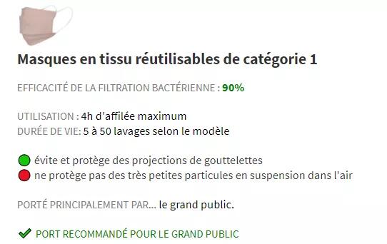 法国目前所有工业化生产的一类可水洗可重复利用的口罩都能达到90%的过滤级别,可以很好地抵抗病毒,但二类织布口罩和普通手工制作的口罩或装饰品口罩无法起到很好地保护作用。