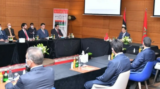 会议现场,图源:阿拉比亚新闻台 双方在会谈后发表的新闻公报中表示,利比亚的政治进程应该由利比亚人掌握,公报呼吁冲突双方进行更多的直接会谈,并希望将本次对话作为一个“高效和透明的工具”,以解决双方的分歧。 据天空新闻台1月24日报道,经济分析人士认为,利比亚石油行业的未来取决于利比亚的政治进程,近日利比亚冲突各方在摩洛哥的谈判进展顺利,这帮助利比亚国家石油公司加快恢复闲置油田和港口的运营。