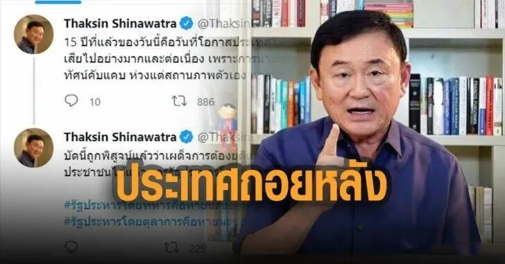 9月19日,流亡海外的前总理他信发文称,“15年前的今天发生的事,导致泰国及泰国人失去了发展的机会。一些拥有狭隘世界观的人,为了自身利益,以爱国和拥护王室为名实施专制,导致国家倒退。